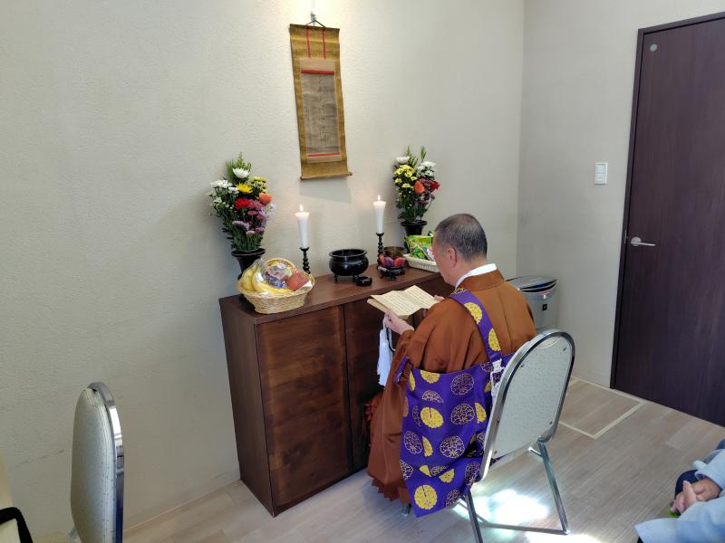 念空寺住職の読経から始まり、ご参列者の回し焼香、最後に住職の法話より、浄土真宗は念仏を唱えることで亡くなると同時に誰もが極楽浄土へ往生(仏になる)できる。既に救われていることへの感謝、喜びの心で念仏を唱える。